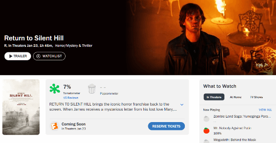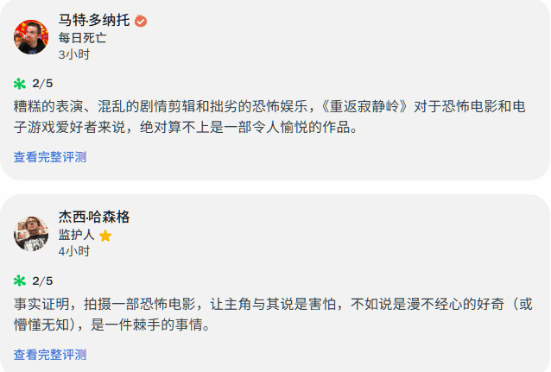 评测员纷纷表示,本作剧情设计混乱,演员表演平庸,恐怖氛围也渲染得很差劲。最重要的是,导演显然没有理解《寂静岭2》游戏原著的精髓所在。“无论是对于《寂静岭2》原著粉丝还是恐怖电影爱好者,这部电影都绝对算不上一款好作品。”