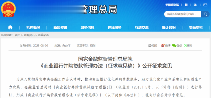 近日,国家金融监督管理总局发布《商业银行并购贷款管理办法(征求意见稿)》(下称《办法》),向社会公开征求意见。