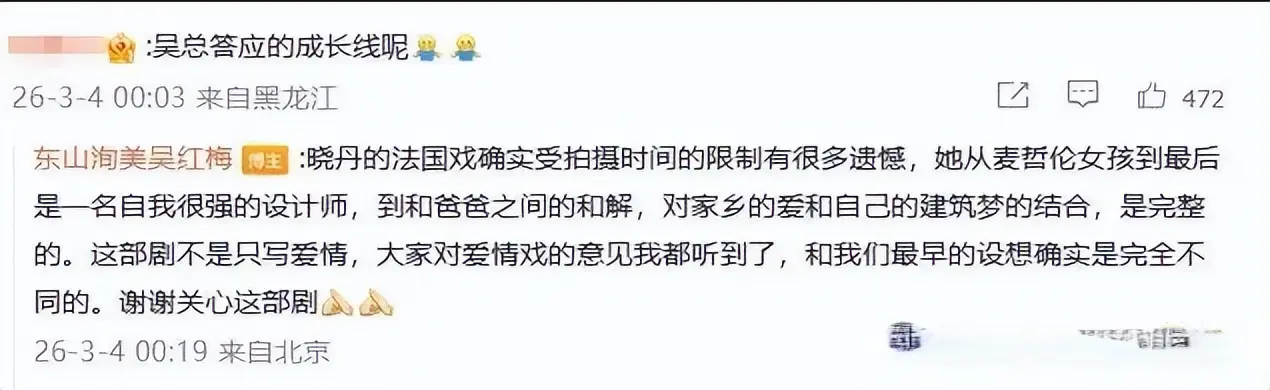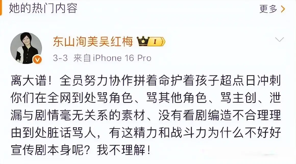 大结局当天,吴红梅还发文怒斥“捣乱的人”,觉得这些人在践踏主创团队的付出。可问题是,观众和粉丝的质疑,从来都不是“捣乱”,而是对创作的尊重——严晓丹的人设问题是客观存在的,这是剧方的创作失误,不是演员的表演问题,观众有权利指出问题,粉丝有权利为偶像的心血发声,这从来都不是“恩将仇报”。