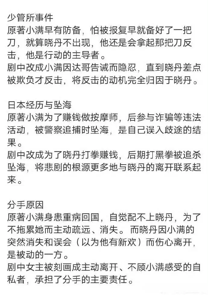 更气人的是人设魔改!原著里,男主张小满的悲剧源于自身误入歧途,和女主毫无关系,可剧版直接把锅甩给严晓丹,改成“男主的不幸是女主离开导致”;原著里是男主生病主动避让,剧版却改成女主因愧疚提分手,连她赴法追梦的情节都被拍得十分负面,反观男性角色的同类选择,却被赋予正面评价。
