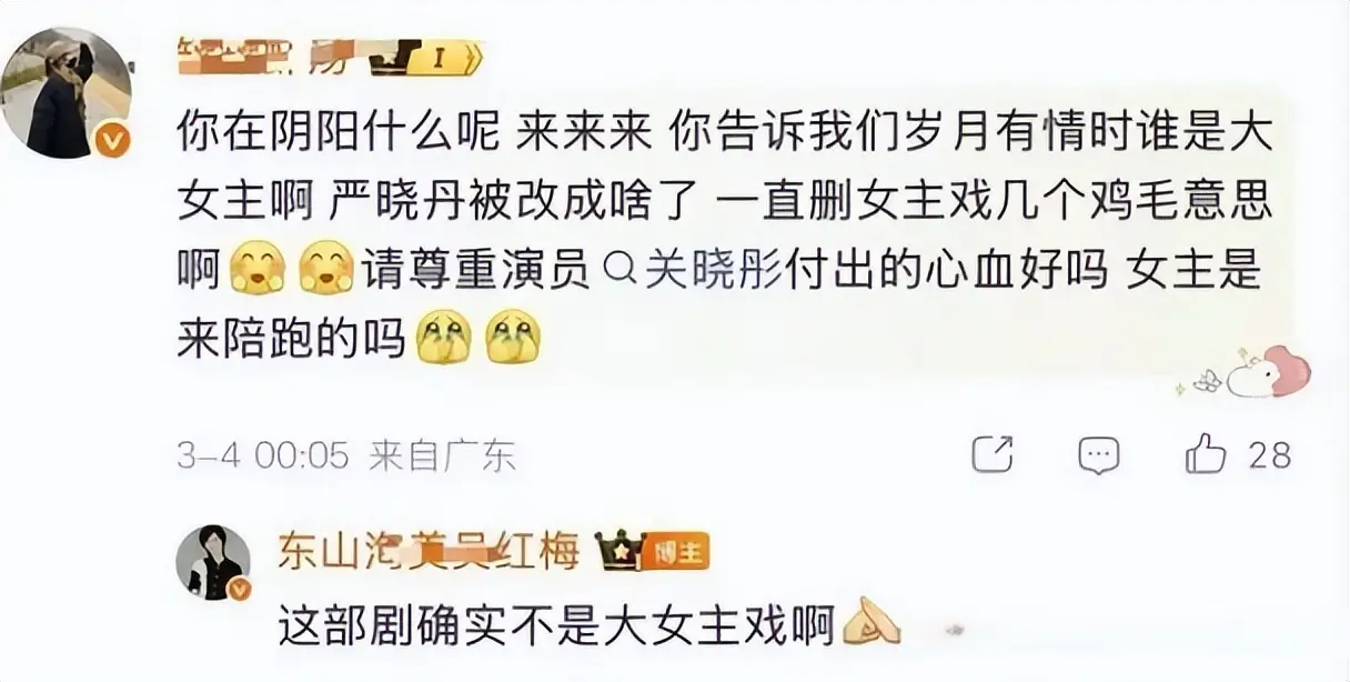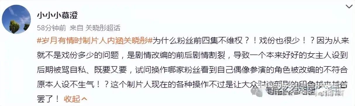 最后,来和捕娱姐聊聊:你觉得《岁月有情时》的戏份删减和人设魔改,是谁的问题?制片人暗讽关晓彤拿角不正,是不是太过分?粉丝维权真的没必要吗?