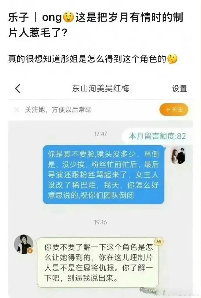 真正让舆论彻底炸锅的,是吴红梅回复粉丝私信的一段话,堪称内娱最没体面的制片人发言:“你要不要了解下这个角色她是怎么得到的?你在这儿埋制片人是不是在恩将仇报。别逼我说出来。”