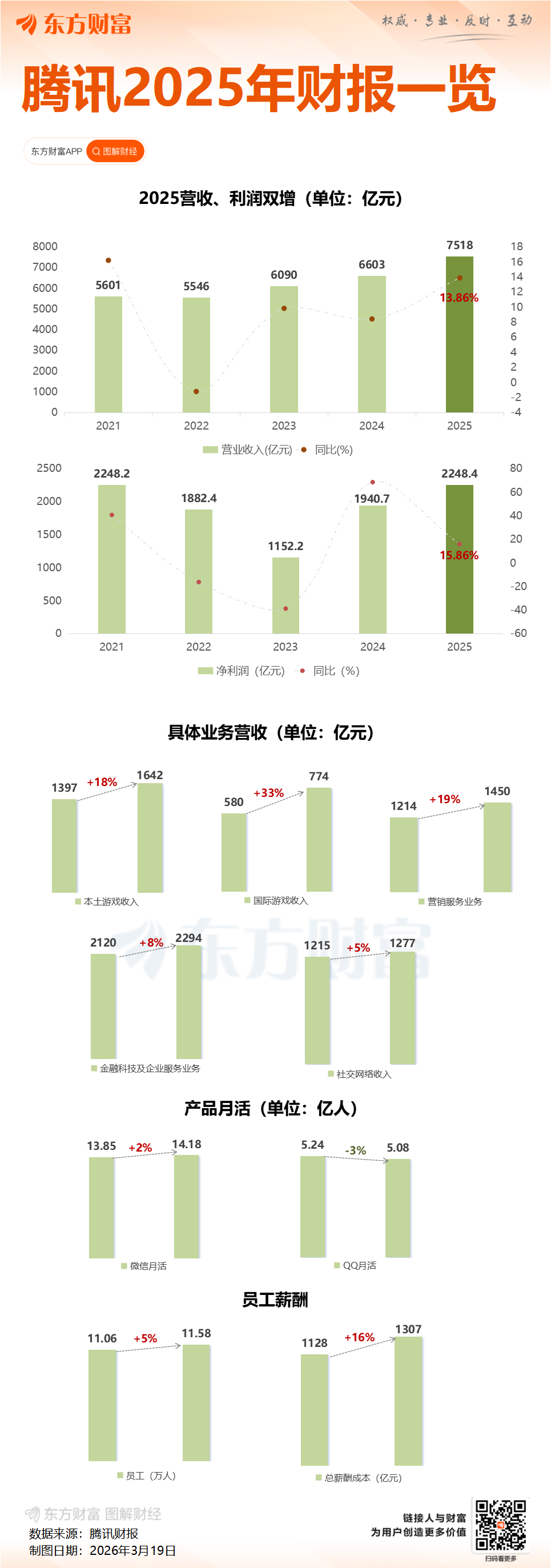 腾讯2025年业绩报告显示,全年总收入达到7518亿元人民币,同比增长14%;非国际财务报告准则下,本公司权益持有人应占盈利为2596亿元,同比增长17%。